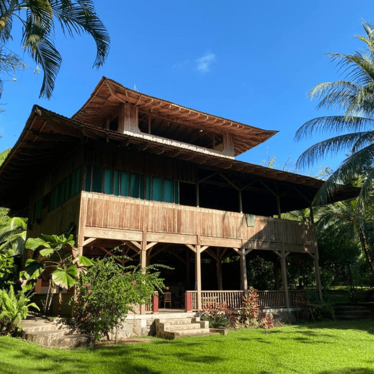 At the ecolodge’s center, a three-story pagoda-style Yoga shala overlooks the jungle and ocean. The ground-floor Dharma Hall (1,600 ft² / 150 m²) offers naturally cool space for gatherings and workshops, while at mid level your hardwood Yoga floor (1,076 ft² / 100 m²) is complete with yoga props — endearingly called “foot candy,” crowned by an observatory cupola — prana filled — panoramic views and ocean breezes.